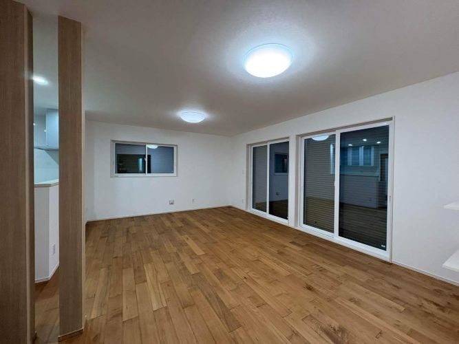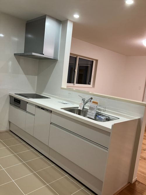 対面キッチンから見える大きな窓。