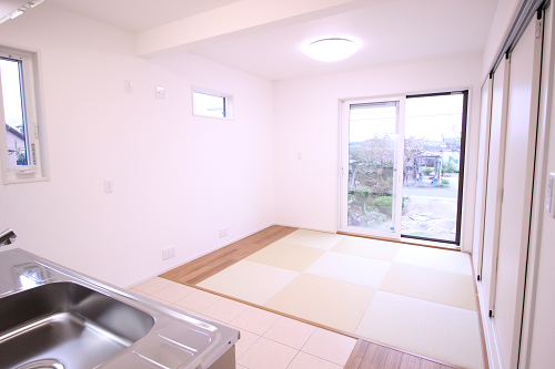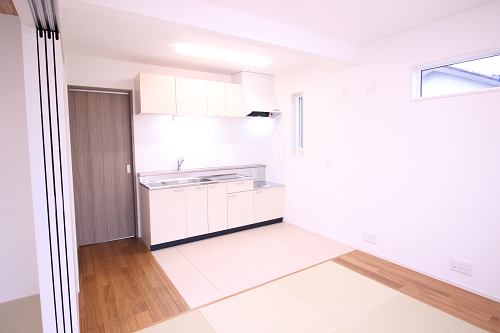 親世帯のリビングは壁付けキッチンにしてリビング床を畳にしています。