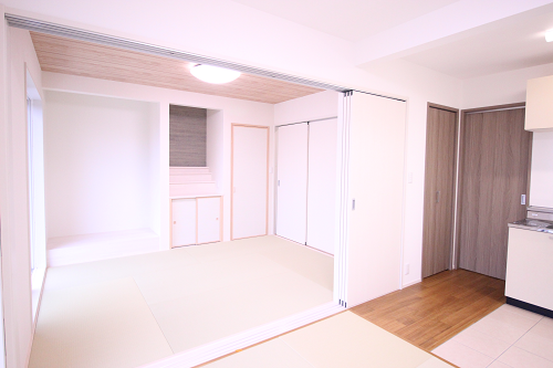リビングと隣り合わせの和室は扉を開ける事で2部屋がオープンに繋がりより広く開放的に感じられます。