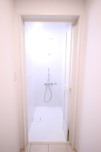 こちらはシャワールームです。タオルや洗剤等消耗品を収納する可動棚を完備。