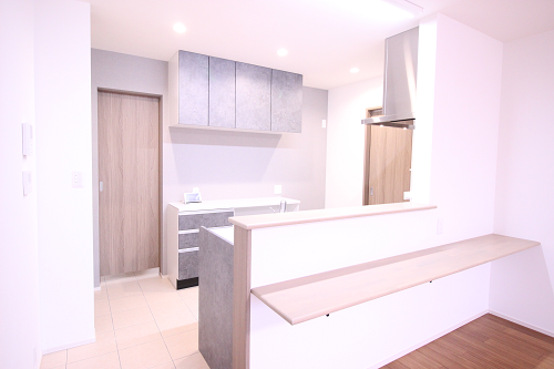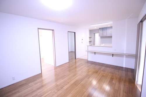 リビング床はピノアースのライト色です。キッチン前の造付カウンターで軽食を取ったりパソコン作業が出来ます。