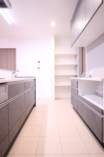 テレビを見ながら寝転がる事ができますね。こちらもキッチン床はタイル張りにしています。