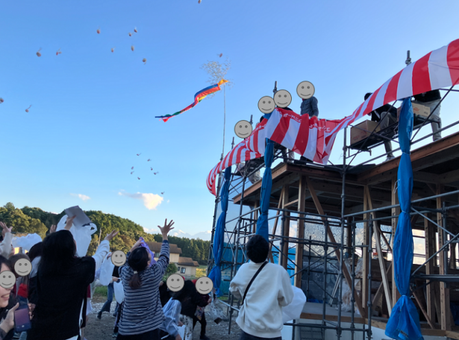 最近ではあまり見かけなくなった「餅まき」ですが、お施主様のご希望で別府店としても久しぶりに行いました!