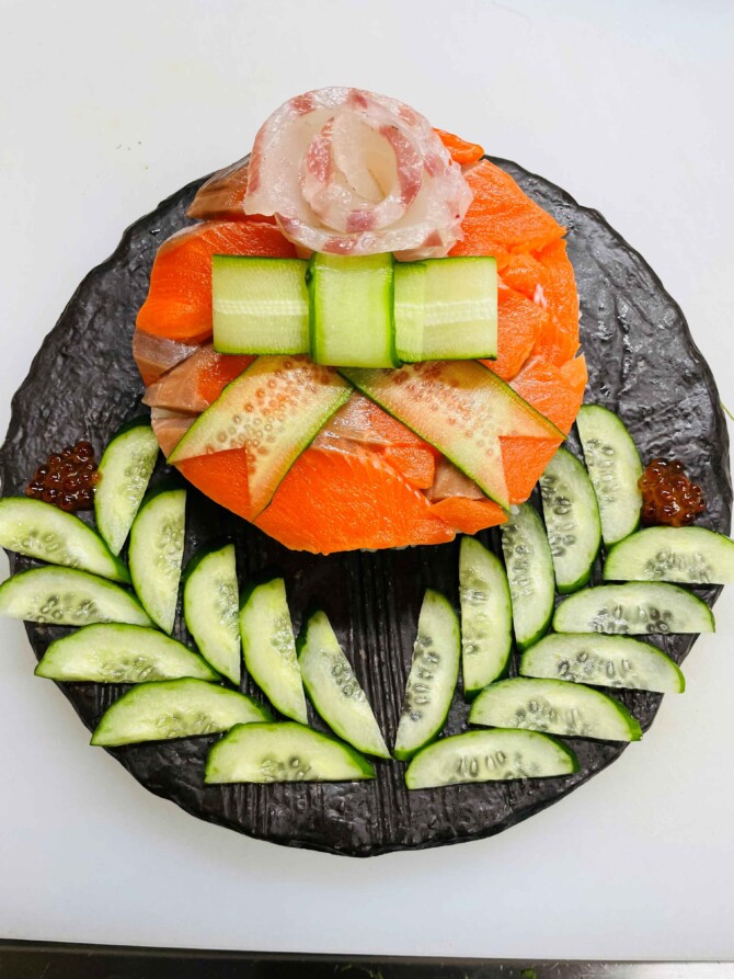 (↑お客様のお誕生日に作ったお寿司ケーキ)