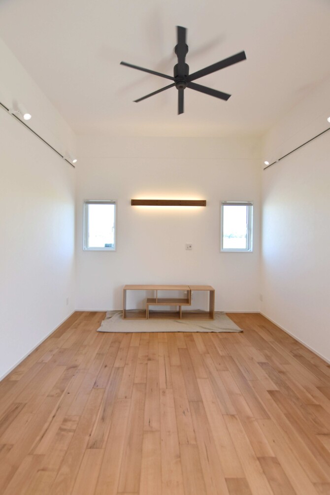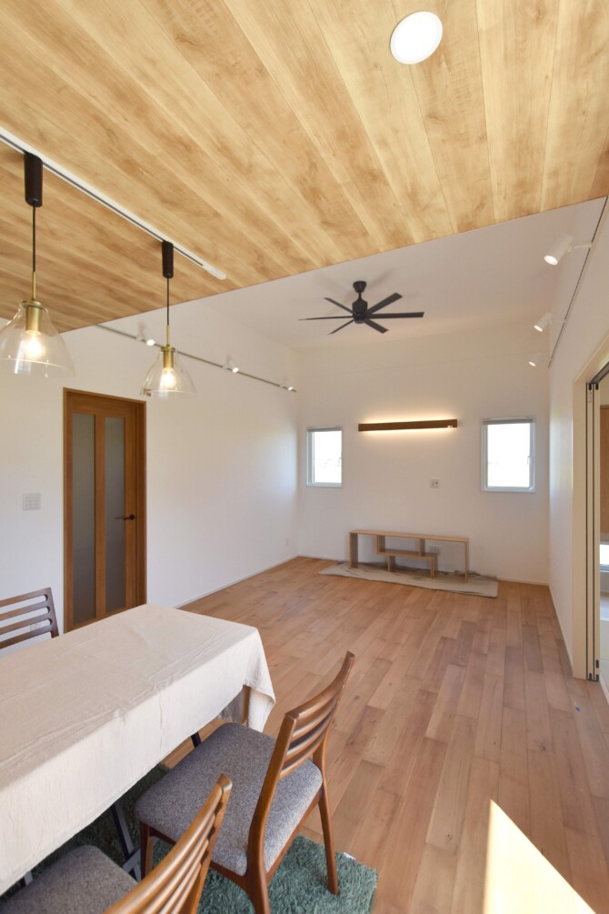 勾配天井と2つの窓で明るく、開放的なリビングに