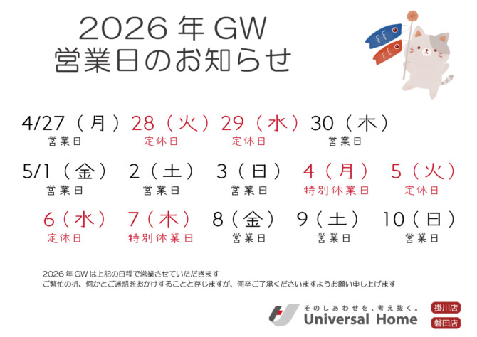 GW期間の営業日のお知らせ【ユニバーサルホーム掛川店】