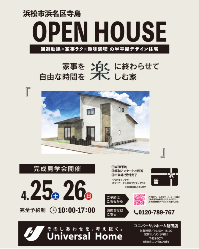 【4/25(土)26(日)浜松市浜名区寺島】新築注文住宅 完成見学会のお知らせ【完全予約制】