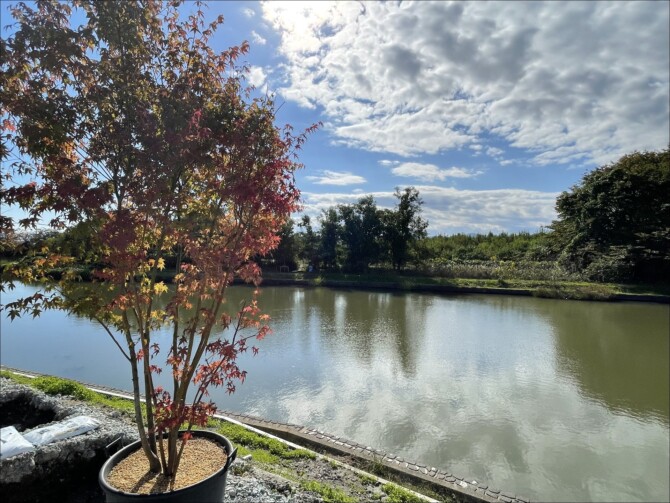 ウッドデッキでコーヒーを淹れ、池を眺めながら愛車を眺める。