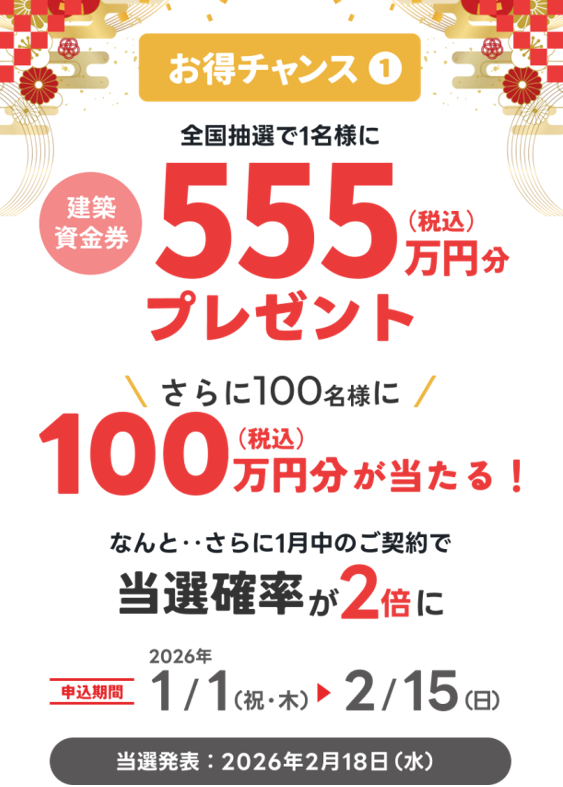 建築資金券555万円分が当たる! 『新春ユニバの大感謝祭』開催中 / 詳しくはユニバーサルホーム伊勢崎店へ