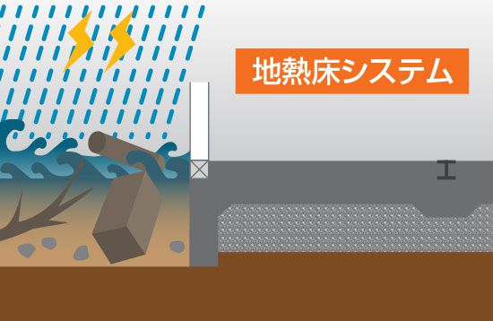 通常の住宅と異なり、ユニバーサルホームの**「地熱床システム」は、床下の空間を土と砕石で密閉し、その上をコンクリートで仕上げる独自の工法を採用しています。これは、地面と一体化した強固な盤石(ばんじゃく)な基礎を形成します。地震の際、この基礎は外部からの振動や揺れを分散・吸収するクッションのような役割を果たし、建物の倒壊を防ぎます。さらに、床下浸水の心配がない防水性の高さ**も、豪雨災害から大切な財産を守ります。