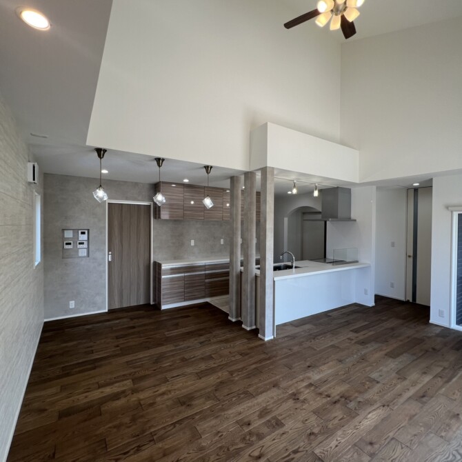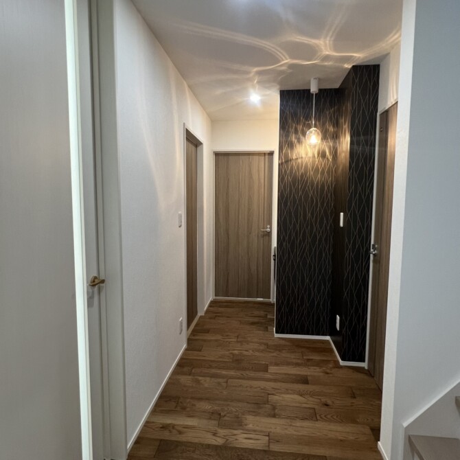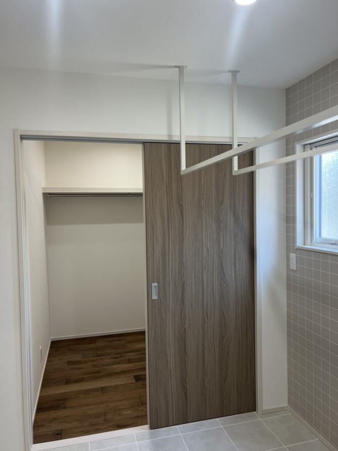 回遊型の間取りで、「家事動線がスムーズです、忙しい毎日もストレスフリー」でご夫婦の主寝室も1階に配置し、完結する間取りとなります。色のチョイスも柔らかな雰囲気で、ご夫婦のやさしさにピッタリな色づかいに仕上がりました。