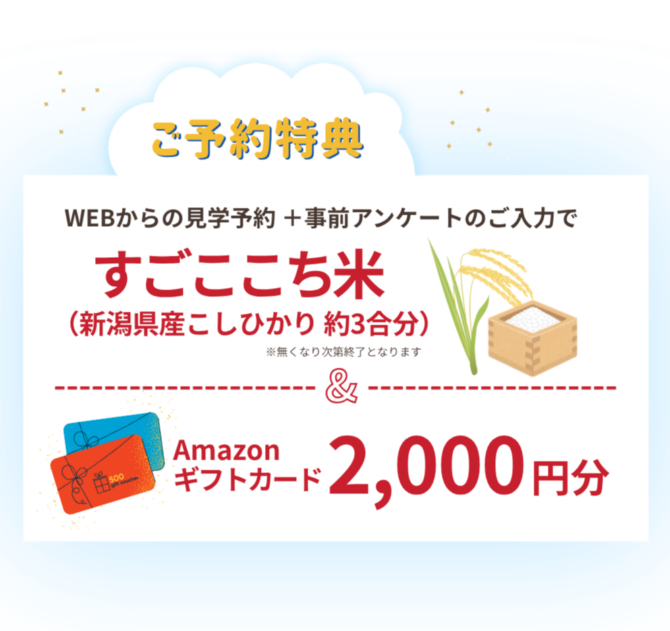 ※ご家族様1組につき、初めての来場で1回限りの特典となります。