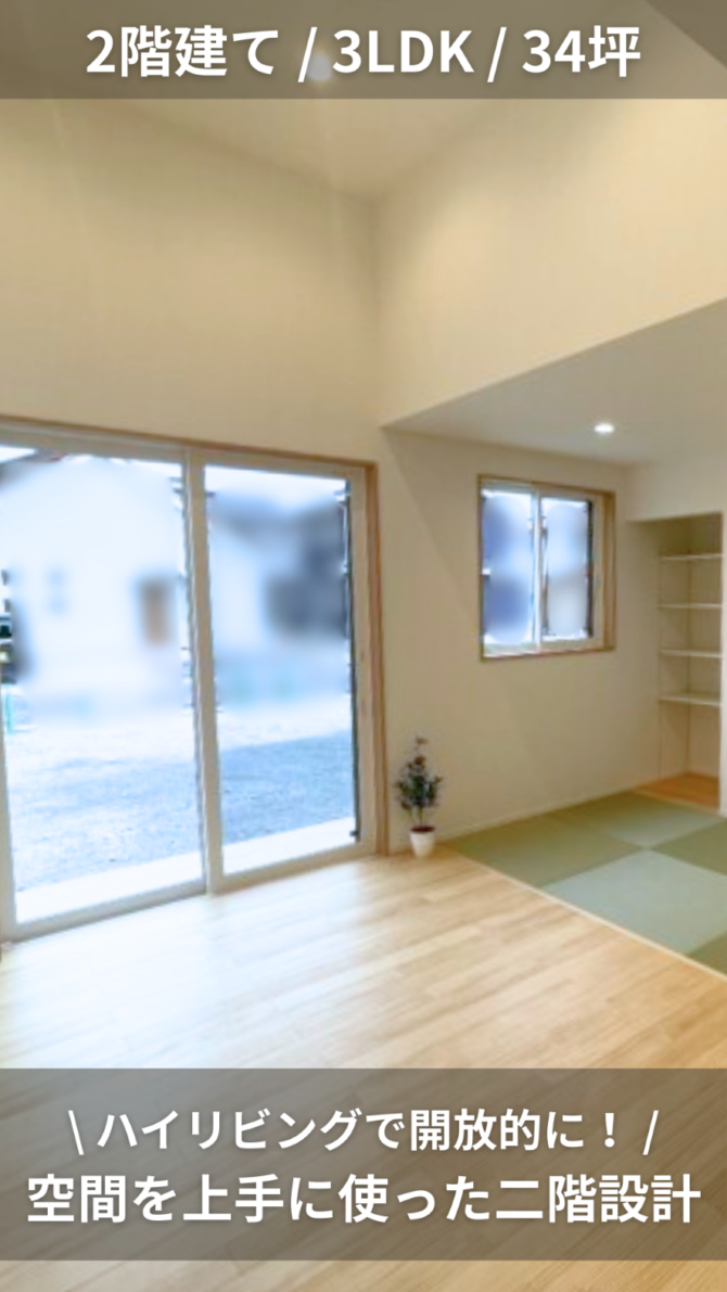 開放的なハイリビング空間を上手に使った二階設計|2階建て / 3LDK / 34坪