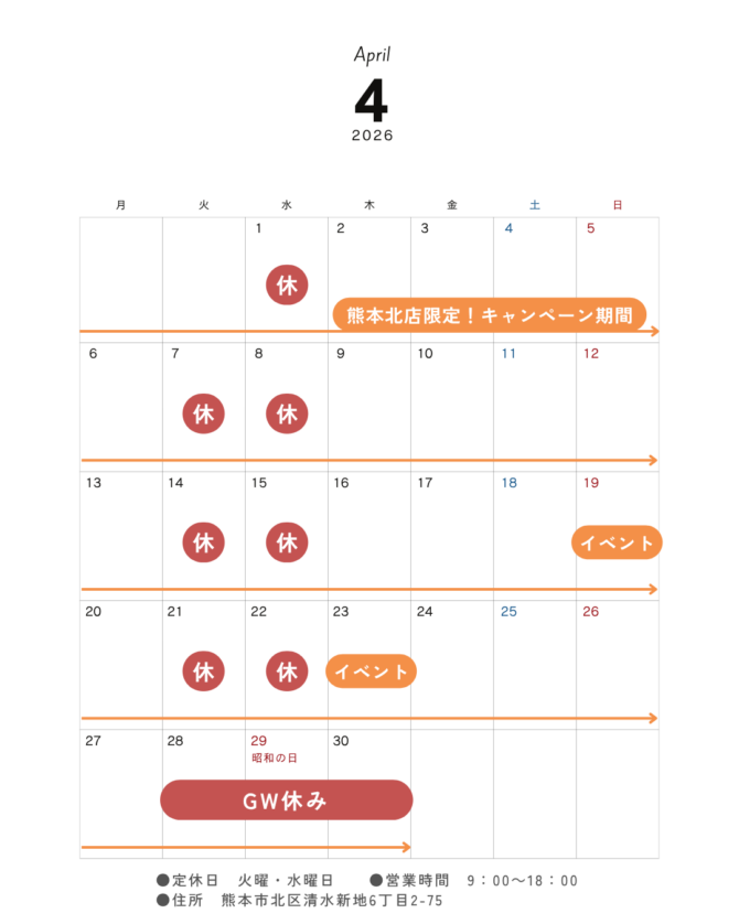 【熊本北店】📅4月営業日カレンダー