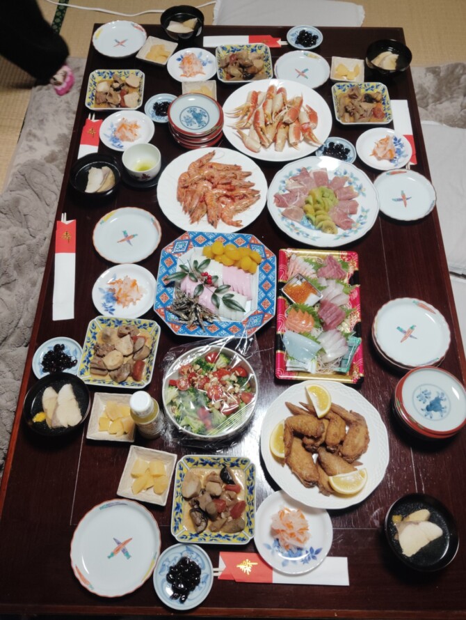 野上家では親戚が多く、年始とお盆は旧宅があるうきは市で集まり事があります。今年も20人程集まり、写真に写っている料理が用意された座卓が3席程設けられました。