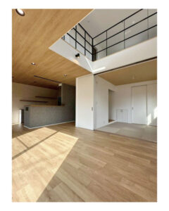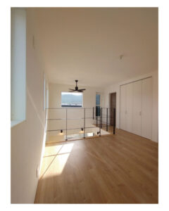 2階に上がると広々としたフロア。大きな窓から沢山の光を取り込み1階と同様に明るい空間になりました。雨の日等の室内干しに絶好の場所です。今回はお家の中、どこにいても温かみのある住宅を紹介させて頂きました。皆様のお家づくりのヒントをこれからもお届けいたします。