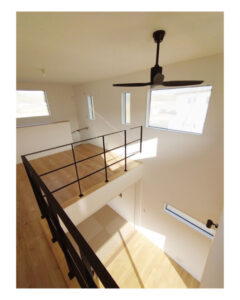 リビングには大きな吹抜けがあり、空間を緩やかに繋げます。吹抜けとシーリングファン。空間のアクセントにもなり1階と2階のお部屋全体の空気を循環させる働きがあり室内温度を均一に保つ役割もあります。