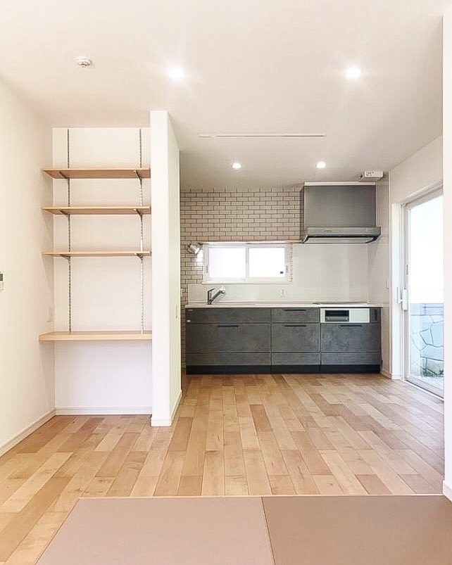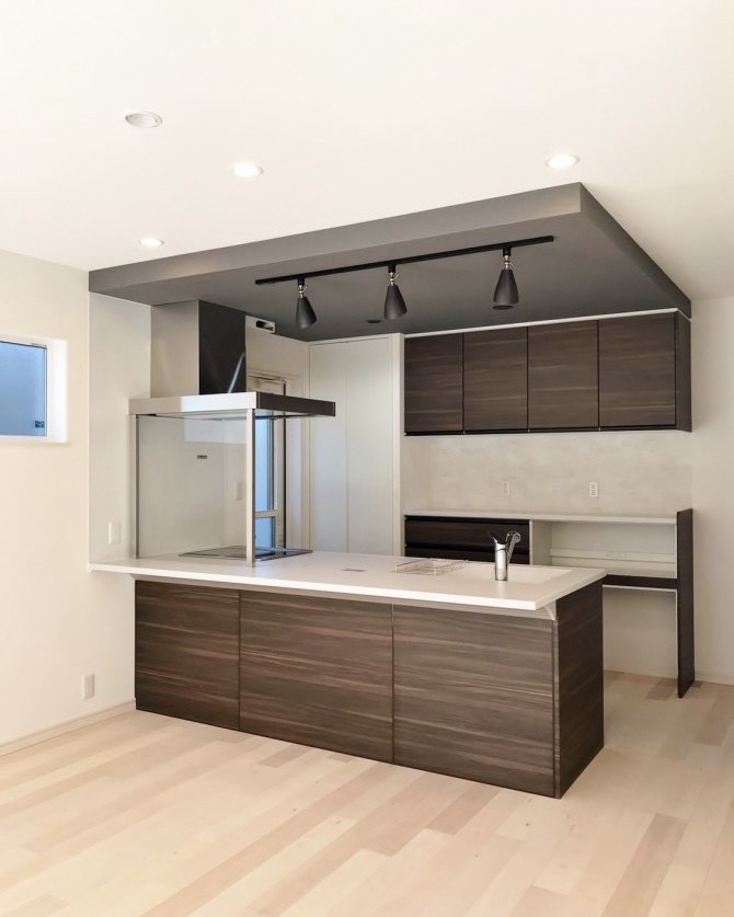 シンプルな色使いが美しいフルフラットキッチンの家。