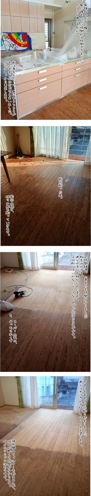 まだまだ削っていない床が残っているのと、細かいやすりでの仕上げのみがきが甘かったので、靴下がひっかかります。もう一度みがき直さないと。