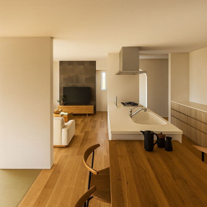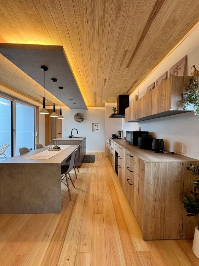 フルフラットキッチンからLDK全体を見渡せる開放的な空間。