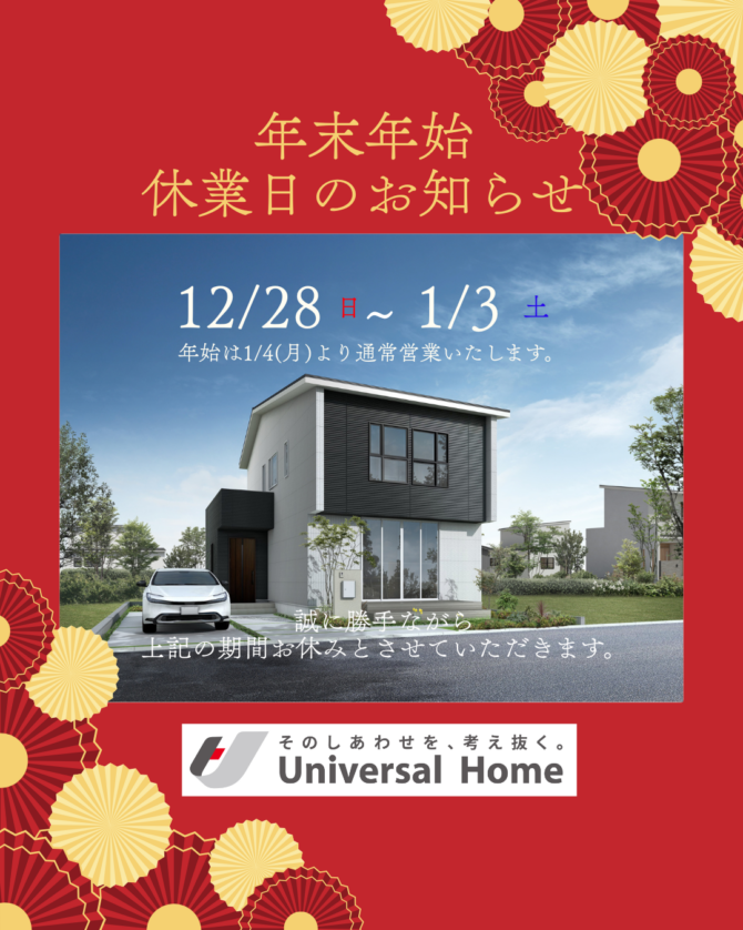 🎄年末年始のご案内🎍 2025.12.16 こんにちは!ユニバーサルホーム広報担当です😊 皆さま、今年も残すところあとわずかとなりましたね。 急に冬らしくなり、寒さが身に染みる季節ですが、いかがお過ごしでしょうか? 今回は、年末年始の休業期間についてお知らせさせていただきます。 🏡 年末年始の休業期間について 休業期間中にいただいたお問い合わせやご予約につきましては、 1月4日(日)以降、順次ご対応させていただきます。 ご不便をおかけいたしますが、何卒ご理解のほどよろしくお願い申し上げます。 当店のInstagramはこちらから