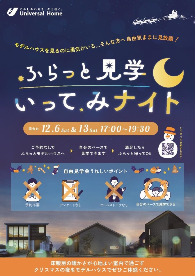 「ふらっと見学いってみナイト」12/6㈯・12/13㈯ 2025.11.28 中津店 夜のモデルハウス自由見学 モデルハウスを見るのに勇気がいる そんな方へ 12/7㈯・12/13㈯ 17:00~19:30 自由気ままにモデルハウスを見放題! ライトアップされたモデルハウスをご覧ください ご予約不要です! 詳しくはこちらの画像またはサイトをご覧ください! ⇩⇩⇩