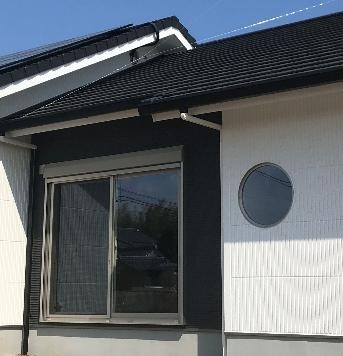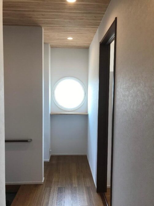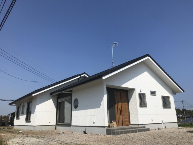 白い壁と丸い窓が特徴的な平屋のお家です。