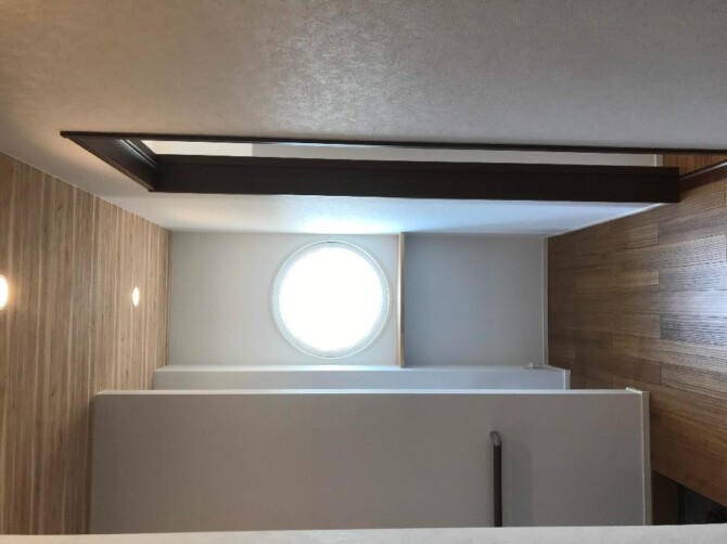白い壁と丸い窓が特徴的な平屋のお家です。