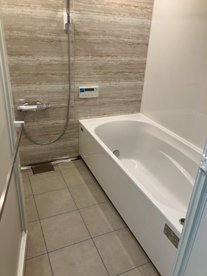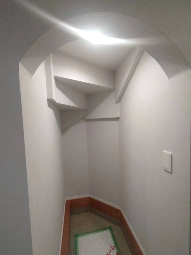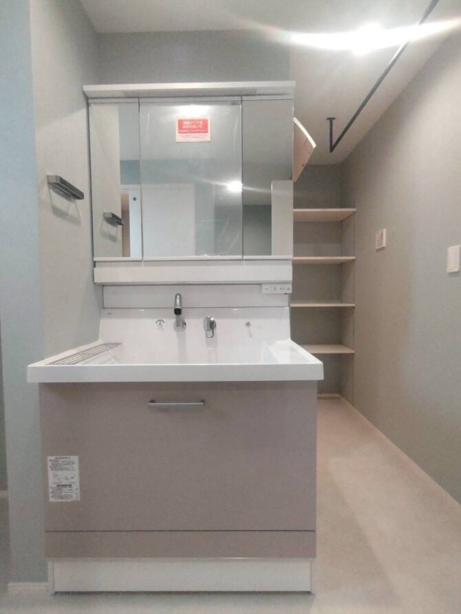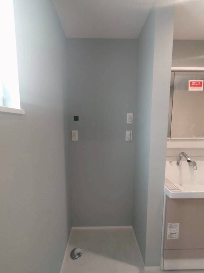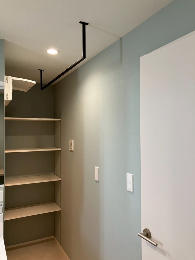 壁紙のカラーがグレー、ドアや棚がホワイトで素敵✨