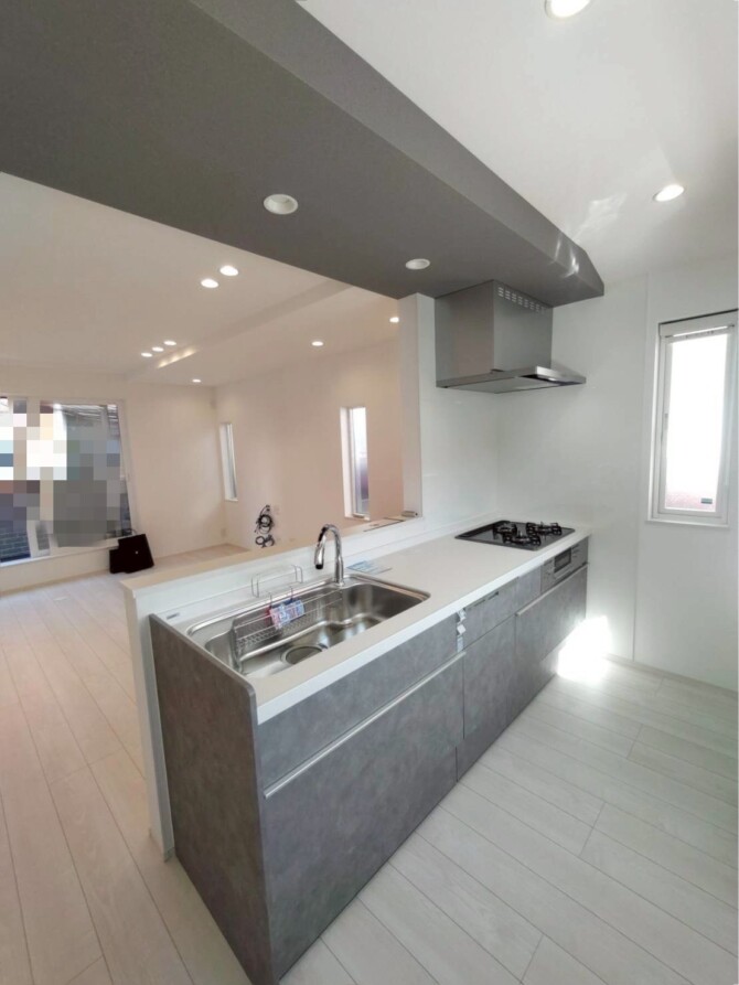 天井のボードとキッチンカラーのグレーが統一されていて、