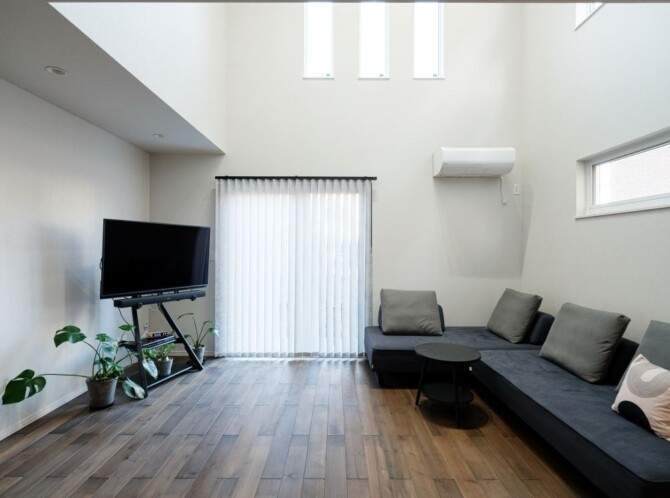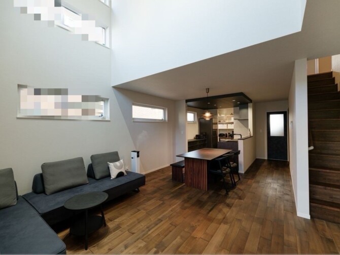大きな吹き抜けからやわらかな光が差し込む、