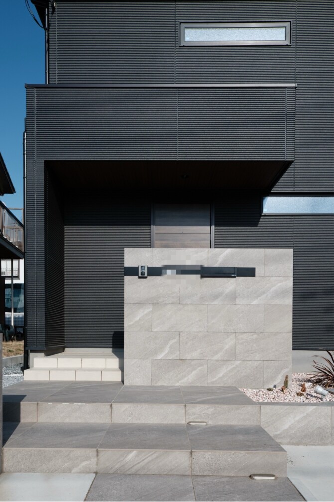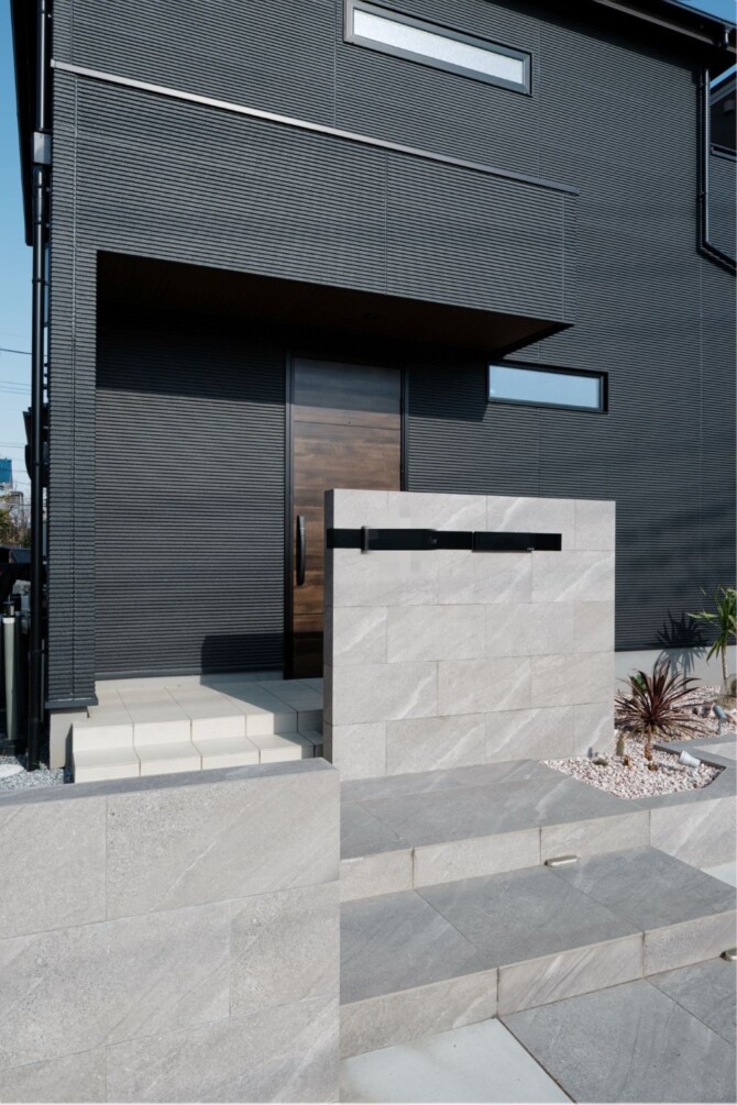 アプローチ部分には明るい色のタイルやコンクリートを使用。