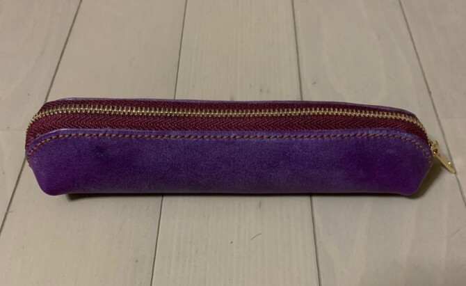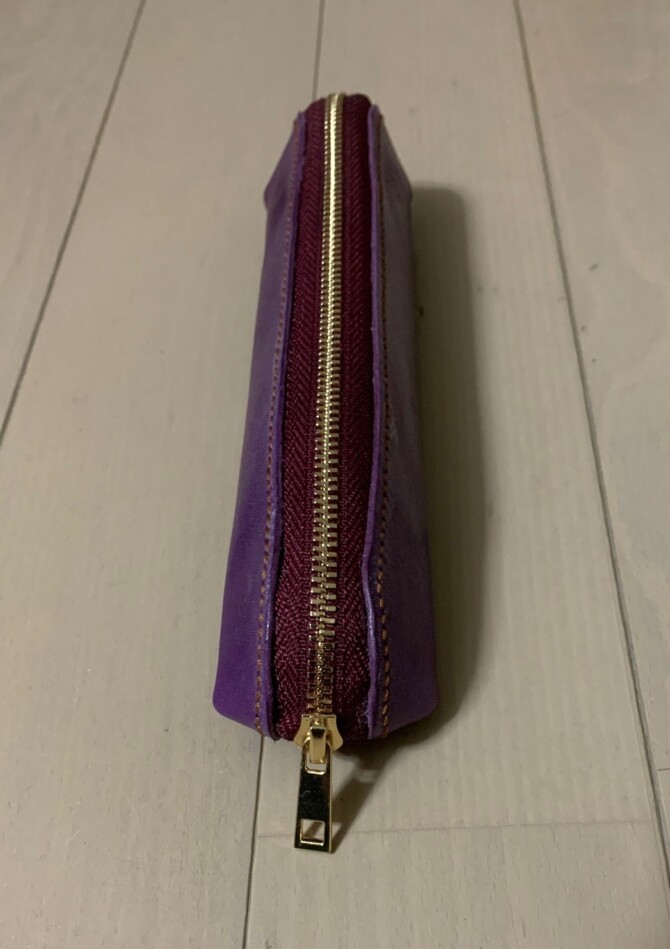 スリム型 2026.02.09 イオンモール大牟田店のEです 久しぶりの投稿です 今回は知人から『スリムなペンケース』を お願いされたので作製してみました 形はスリムでペンが3.4本入ります 紫色が良いということなので 牛革のバイオレット ファスナーはゴールドの3号 を使用しています