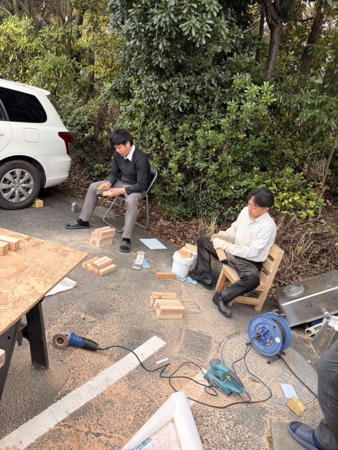 木工体験の木材加工を皆でがんばてます(*’▽’)