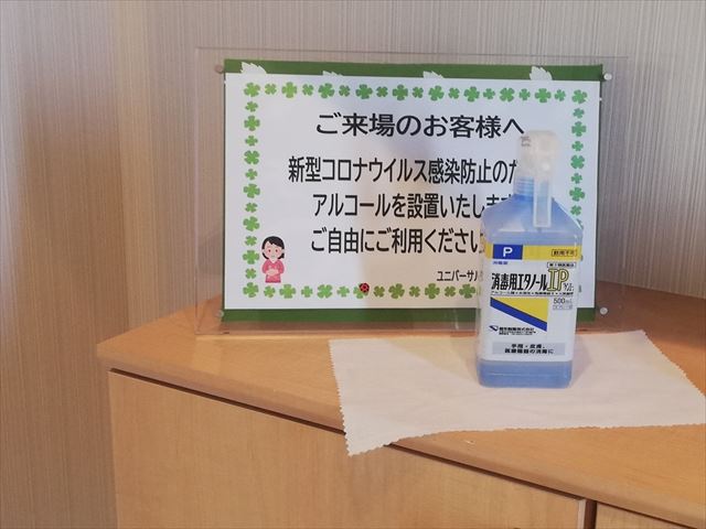 新型コロナウイルス感染防止のため、玄関にアルコール消毒液をご用意致しました。