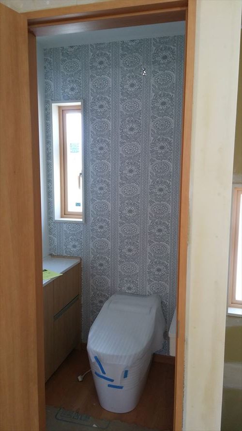 トイレのクロス 2018.07.07 こんにちは。 今日は7月7日七夕ですね♪ 子供のころは短冊にお願い事を書いて笹の葉に吊るしましたね。 本日はS様邸のトイレのクロスをご紹介します。 白色のクロスとブルーグレーの花柄のクロスで爽やか&おしゃれなトイレになりました。 トイレの中には手洗いキャビネットもついています。 収納もあって便利ですね。 まだクロス工事が続きます。 完成までもう少しです。