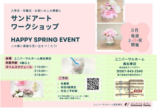 3月毎週土日サンドアートワークショップ開催 2026.02.27 🌸サンドアートワークショップ🌸 \ 3月毎週土日開催 / おうちのインテリアにいかがでしょうか(*^▽^*) 春らしい色合いのパーツをたくさんご用意しております! みんなでわいわい楽しいワークショップにしましょう♪ 🌸ご予約方法🌸 お電話もしくはHPからのご来場予約をお願い致します。 🌸お問い合わせ先🌸 ユニバーサルホーム高松東店 TEL 087-843-2340 ※定休日:毎週火曜、水曜