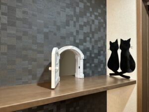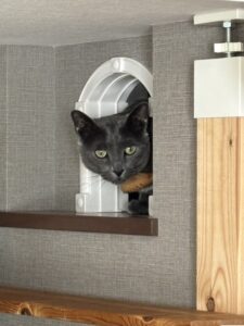 ネコちゃん専用のくぐり戸から、ひょっこり顔出した