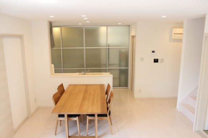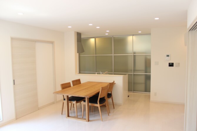 キッチン収納を隠して生活感を無くしたキッチンダイニング。