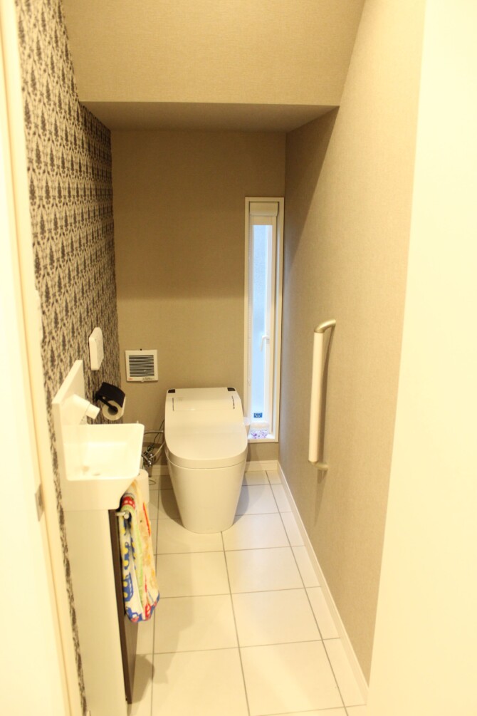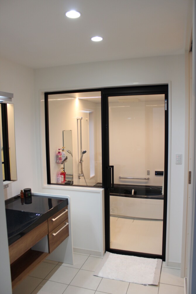 トイレは一面だけデザイン壁紙、お風呂は中が見えるガラス張りに。