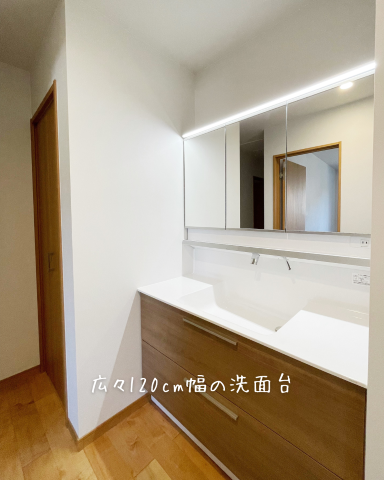 広々120cm幅の洗面台は両端が壁との隙間がなく、