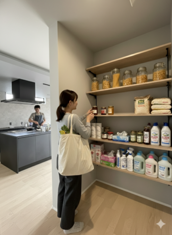買い物帰りにストックをパントリーへ置いて