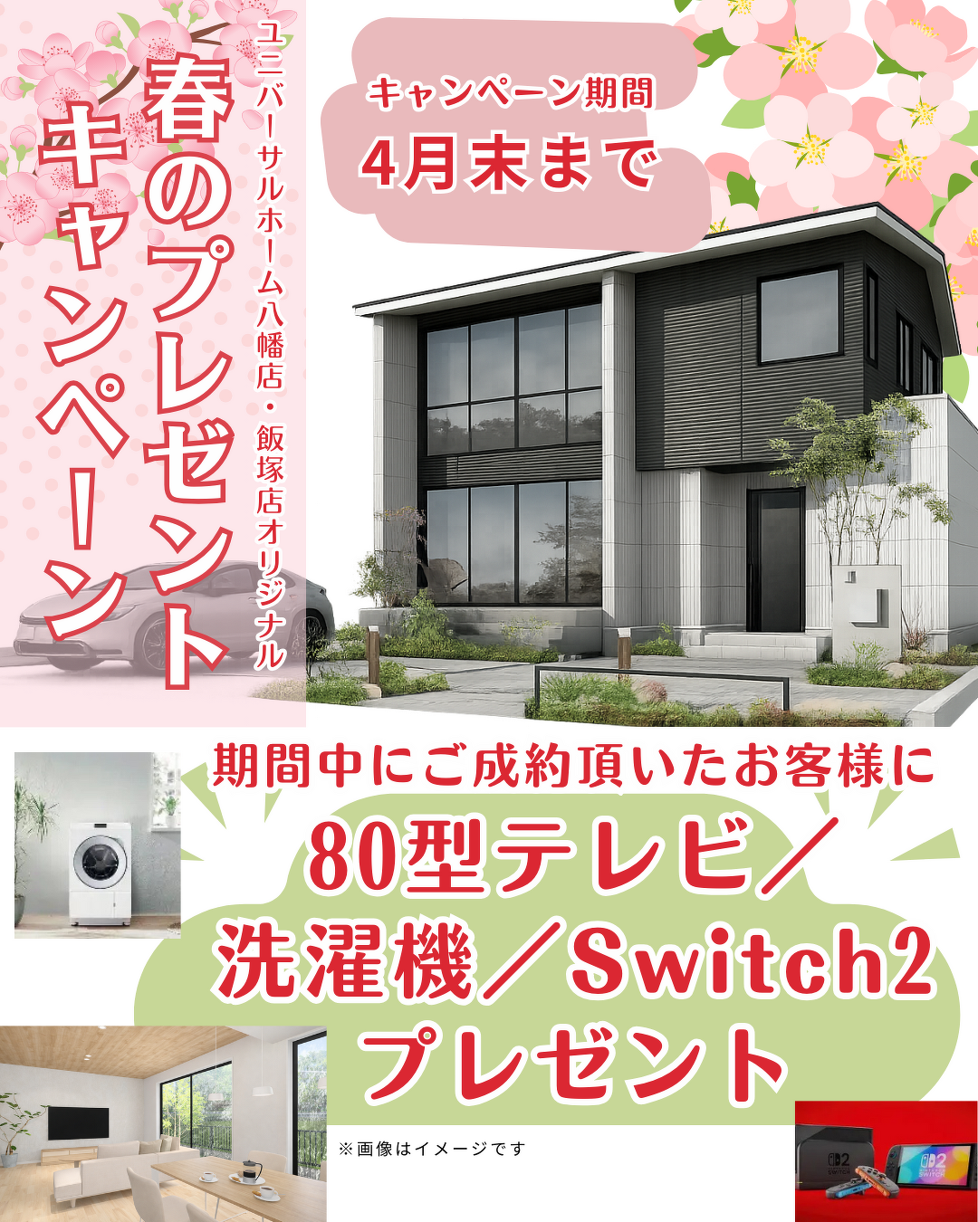 八幡店 春のオリジナルキャンペーン開催!! 2026.03.15 八幡店・飯塚店 春のオリジナルキャンペーン開催!! 新居にぴったりな新しい大型テレビがもらえます!! Switch2で家族時間を満喫♪ 詳しくはスタッフまでお気軽にお問い合わせください(^^)/