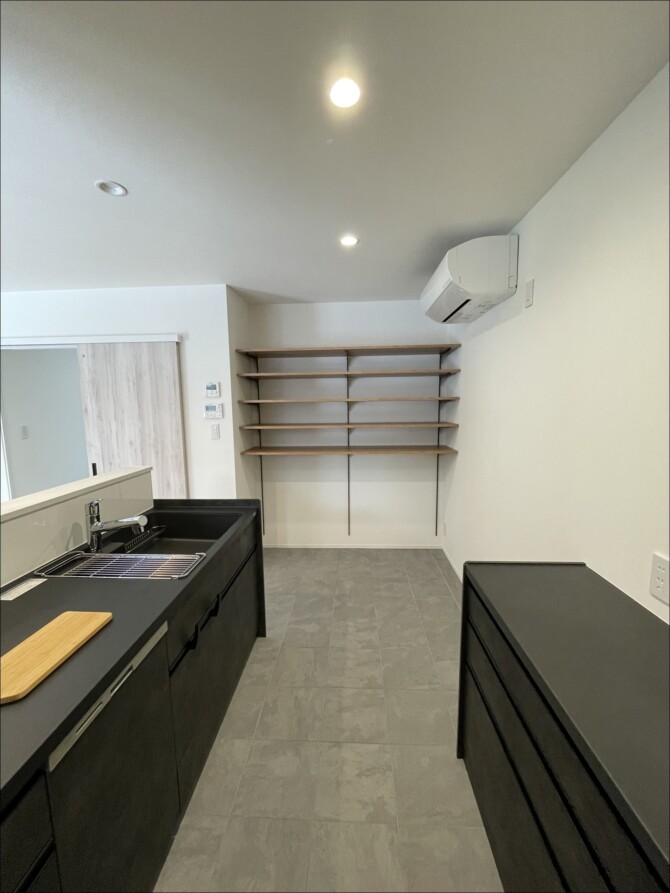 ブラックでかっこいいキッチンに、床はグレーのタイル。