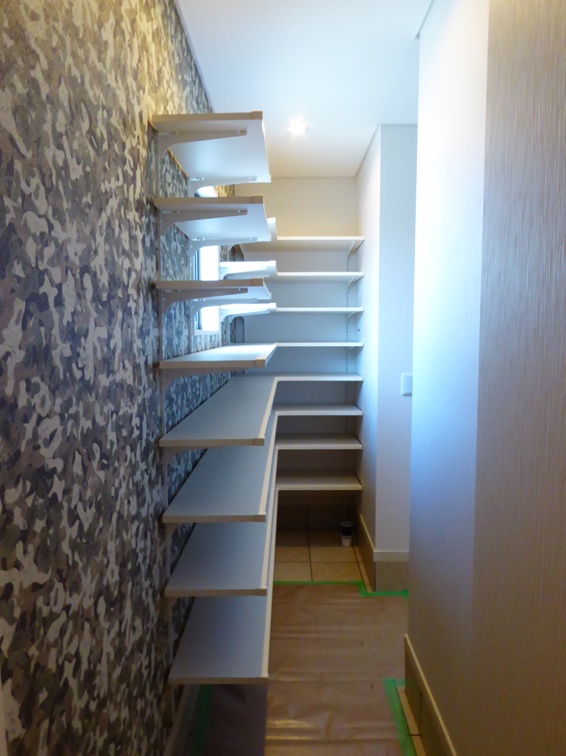 棚板を配置したL型で大容量の収納を確保。