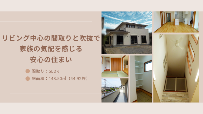 施工事例77 「リビング中心の間取りと吹抜で家族の気配を感じる安心の住まい」
