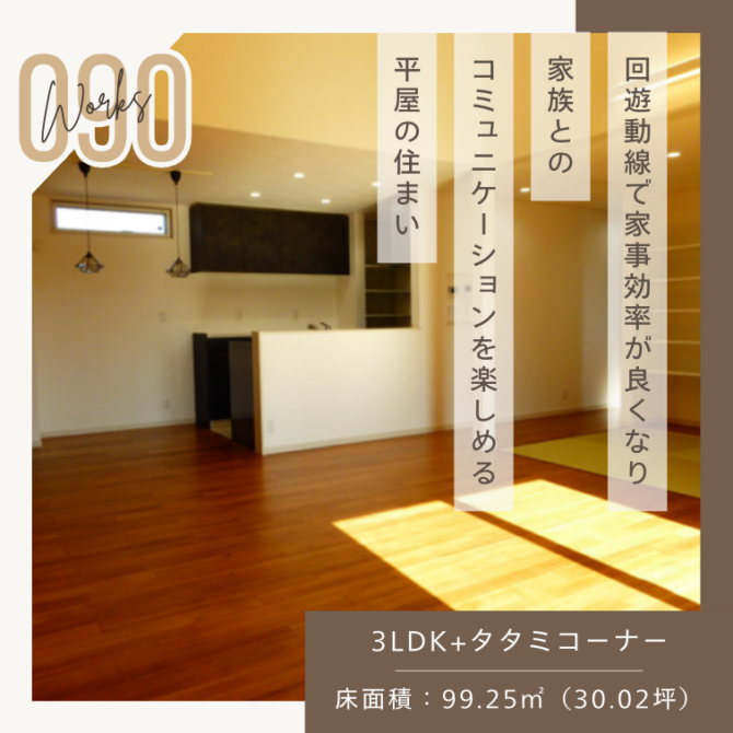 施工事例90 「回遊動線で家事効率が良くなり家族とのコミュニケーションを楽しめる平屋の住まい」