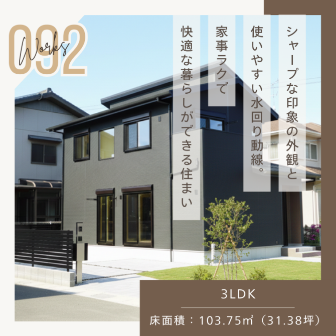 施工事例92 「シャープな印象の外観と使いやすい水回り動線。家事ラクで快適な暮らしができる住まい」