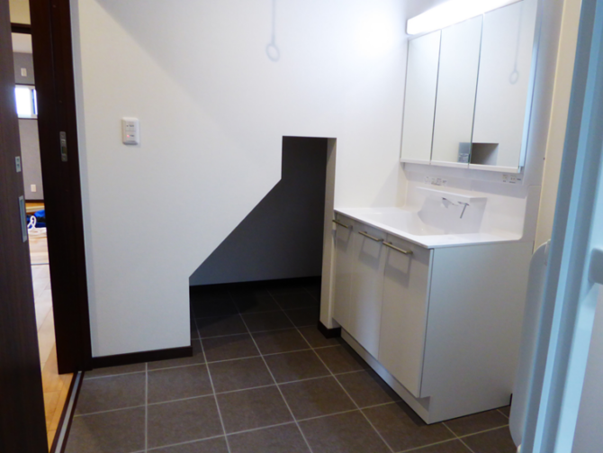 洗面所には階段下を利用した収納を設けました。