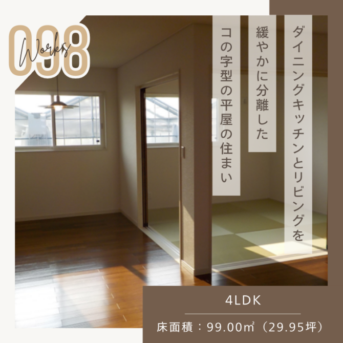 施工事例98 「ダイニングキッチンとリビングを緩やかに分離したコの字型の平屋の住まい」